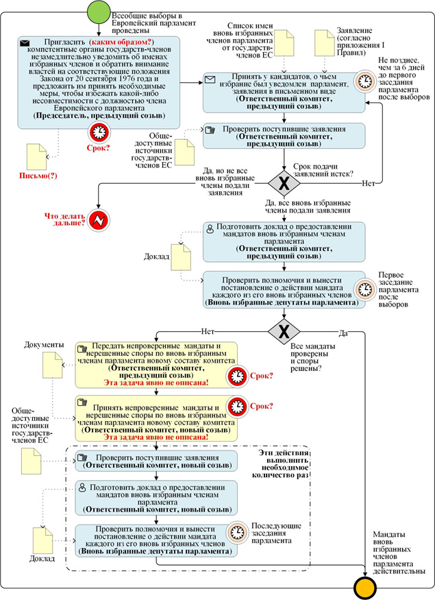 Европейский парламент Правило 3: Проверка полномочий (Rule 3 : Verification of credentials) [11], логическая схема показана на рис. 2. Представлена часть процедуры, в которой описывается только проверка полномочий и действительность мандата вновь избранных членов Европейского парламента.
