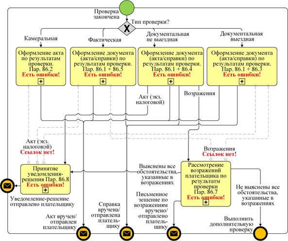 • Не указан срок оформления справки после окончания выездной проверки, но при этом срок оформления акта «жестко привязан» к этой дате. В тексте описаны сценарии развития процесса, начинающиеся с вопроса (шлюза) «Проверяемое лицо согласно встретиться?», но нет задачи «Известить проверяемое лицо о времени и месте подписания акта», которая этот вопрос задает (при этом, в Статье 101 кодекса в аналогичной ситуации такая задача есть).