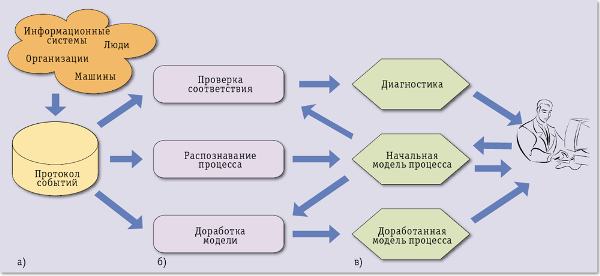 Например, по отметкам времени к ней можно добавить информацию о сроках (время ожидания и время обслуживания). Результирующую доработанную модель процесса можно применять для принятия решений. Анализ процесса: а — c помощью алгоритмов распознавания процесса по протоколу событий автоматически строится модель; б — на этапе проверки соответствия выявляются различия между наблюдаемым и смоделированным поведением; в — начальная модель дорабатывается с использованием данных о событиях