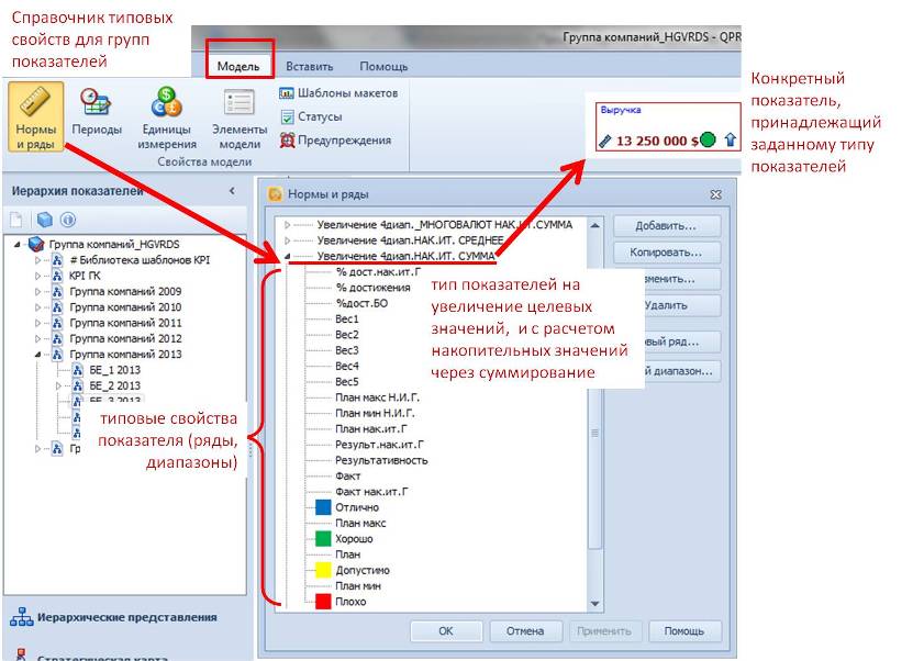 Рис.5. Настройка типовых свойств для групп показателей – Нормы и Ряды На рис.6. наглядно показано, какие возможности обеспечивают те или иные свойства (ряды) данного типа показателей.