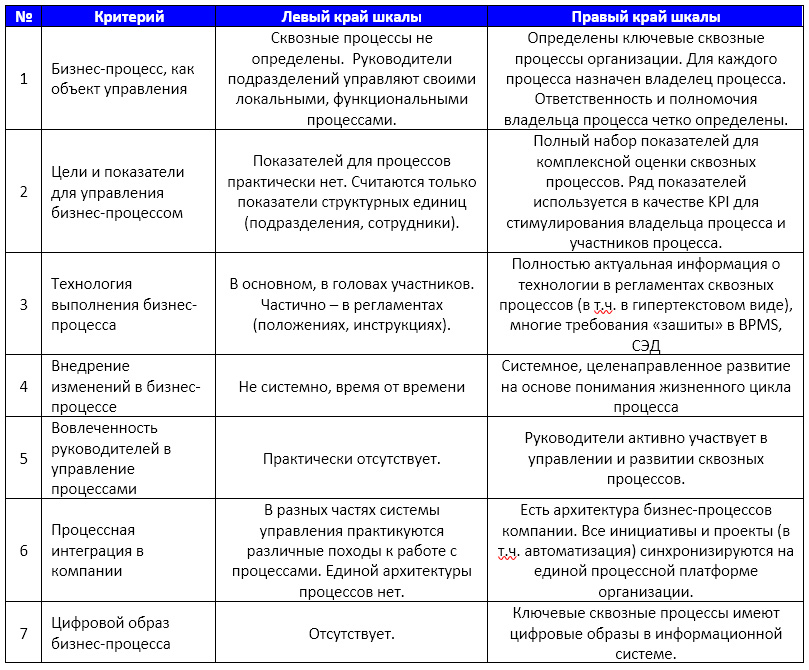 Таблица. Критерии оценки уровня развития процессного управления