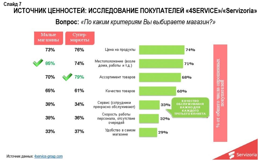 Теперь поговорим о критериях проверки магазинов и методике оценки выполненных проверок. Тут я решил “заморочиться” - иначе не скажешь об этом вернее - и взял за основу исследование, опубликованное сайтом https://servizoria.com/ о предпочтениях покупателей супермаркетов и магазинов у дома (слайд 7).
