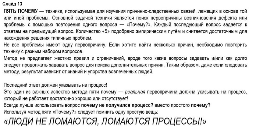 Для анализа причин несоответствий вы можете использовать различные инструменты, здесь важно качество самого анализа, а не конкретный выбор. Мы в рамках пилотного проекта на сессии с владельцами создающих стандарт сервиса (!) бизнес-процессов использовали 5WHYS, плавно переходящие в 4QUESTIONS. Спасибо замечательному эксперту по “русскому” “Бережливому Производству” Алексею Игнатюку за вдохновение этими инструментами! Результаты анализа причин можно увидеть на следующих слайдах (см. слайды 13, 14 и 15, 16). Слайды 13, 14, 15 и 16