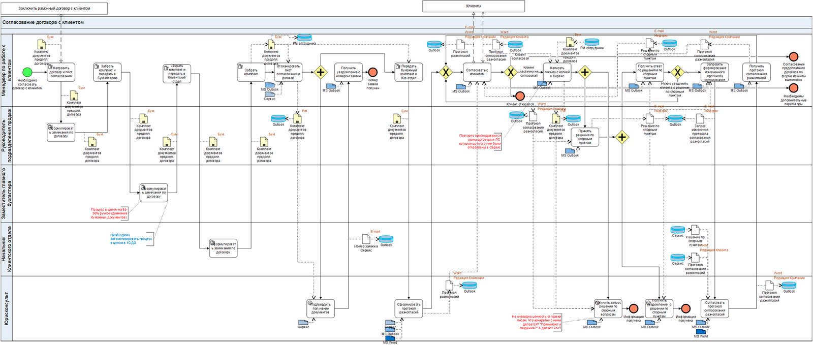 - отсутствие четкого бизнес-правила по отправке проекта договора клиенту (что сначала: проверка у юриста или отправка документа клиенту).