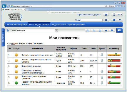 сразу доступны на портале для контроля и анализа ответственными лицами. Текущее состояние каждого из ключевых показателей деятельности компании ответственные лица наглядно видят с помощью цветового сигнализатора "Статус". Сигнализатор светится зеленым, когда показатель в пределах заданной нормы, желтым - при выходе в "тревожную" зону, и красным - при попадании в критическую зону значений. Также можно увидеть положение показателя относительно заданных границ. Руководителю демонстрируется тренд показателя - рост или снижение по сравнению с предыдущим периодом.