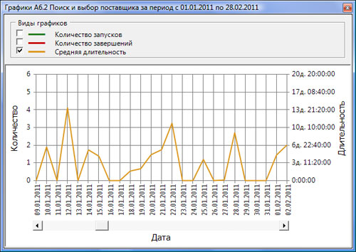 Рис.3. График средней длительности процесса С помощью технологии drill-down (детализация данных путем декомпозиции процесса) возможно добраться до первопричин таких отклонений и понять, в каких именно операциях процесса существуют проблемы. Эти проблемы далее устраняются на этапе Проектирование и, таким образом, цикл замыкается.