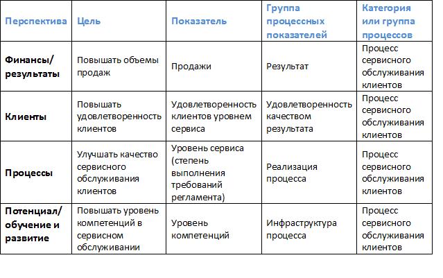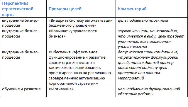 Отечественные компании используют подход ССП (сбалансированная система показателей) для конкретизации стратегических целей, пользуясь преимуществом метода наглядно показать логику связей между целями в стратегической карте компании. При этом, проблем в использовании подхода ССП на практике много, и эти проблемы, как правило, одни и те же в разных компаниях и вполне могут быть классифицированы, «разложены по полочкам». В статье будет рассмотрена часть типовых проблем применения ССП, влияние которых может быть нивелировано за счет применения процессного подхода в управленческой практике: 1. Некорректные формулировки целей в 3 и 4 перспективах стратегической карты (процессы, обучение и развитие) 2. Некорректные показатели (включая некорректные алгоритмы расчета факта) в 3 и 4 перспективах стратегической карты (процессы, обучение и развитие) 3. Некорректные основания для включения целей, показателей в перспективы стратегической карты 4. Варианты понимания сбалансированности Типовые проблемы применения ССП на практике 1. Некорректные формулировки целей в 3 и 4 перспективах стратегической карты (процессы, обучение и развитие) Конечно, данная проблема проявляется в силу разных причин во всех перспективах стратегической карты, не только в 3 и 4. Причины могут быть в то, что: • нет понимания, как формулировать цели; например, не зафиксированы правила (требования), как формировать цель; • или наоборот, вопрос «как формулировать цели?» представляется настолько тривиальным, что не стоит тратить усилий на такой простой вопрос. Но наиболее часто, именно в 3 и 4 перспективах страт карты (процессы, обучение и развитие) допускаются некорректные постановки целей. В итоге, если требования к качеству формулировки целей не зафиксированы, в стратегической карте компании отражаются все варианты «целей» (примеры взяты из практики): Рисунок 1. Примеры некорректных целей. Одна из причин некорректностей – компания не знает свои процессы, или не использует процессный подход, но при этом внедряет подход целеполагания на основе ССП. В этом случае, «сбой» как раз и происходит в 3 и 4 перспективах стратегической карты. Цели «вставили» в стратегическую карту компании, но дальше дело не пошло, так как начала действовать проблема № 2. 2. Некорректные показатели, некорректные алгоритмы расчета факта Принятие в работу цели с непонятной формулировкой запускает цепную реакцию: чем «облачней» сформулирована цель, тем «облачней» подбираются показатели. Чем «облачней» показатели, тем «облачней» определяется алгоритм расчета фактических значений показателя и расчет % достижения целевого значения. В итоге, выстроенная подобным образом система целей и показателей вызывает разочарование и прочие негативные эмоции. Типовая проблема в том, что принимают в работу показатель, который выглядит так, как будто он «счетный» и информативный для принятия решений. Но на практике, «вдруг» оказывается, что алгоритм расчета факта показателя содержит субъективные критерии оценки, не учтены тонкости определений, не учтены исключения. В случае, если нет согласованных критериев оценки, алгоритм расчета факта показателя будет скорее прятать проблемы и делать красивую картинку, чем говорить об отклонениях, на которые можно реагировать. Например, если нет критериев, определяющих,