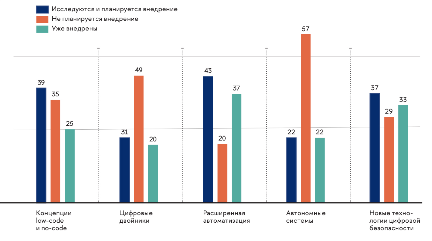 Популярность технотрендов среди российских компаний. Источник: результаты исследования «Главные российские ИТ-тренды 2024» Высшей школы бизнеса НИУ ВШЭ