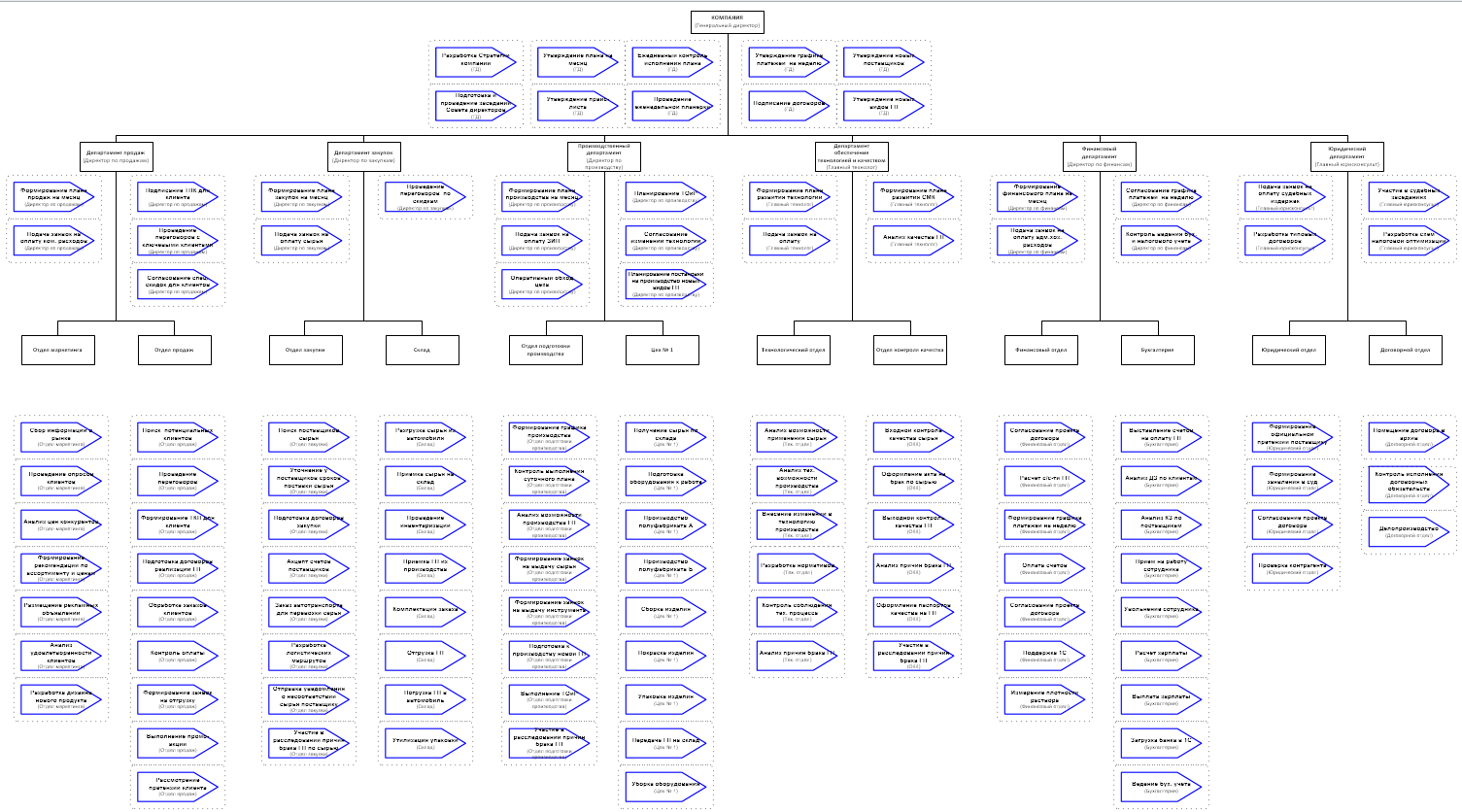 В каждом структурном подразделении и для руководителей верхнего уровня определены «функциональные процессы». Это процессы, которые от начала до конца выполняются в рамках структурного подразделения под полным контролем его руководителя. И это не абстрактно сформулированные функции, например, «Маркетинг» или «Производить продукцию», а вполне четкие процессы с реальными входами и выходами. Но они локализованы внутри подразделений и не являются сквозными или, другим словами, – межфункциональными.