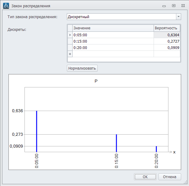 Обратим внимание, что время выполнения первой операции процесса «Оформить оперативную заявку» не является константой. Около 64% всех заявок оформляется 5 минут. В 27% случаев необходимо собирать данные для заявки, а это занимает 15 минут. В 9% случаев сбор данных занимает 20 минут. Такое дискретное распределение было выбрано, т.к. реальный закон распределения времени формирования заявок неизвестен, учета нет. Со слов экспертов по процессу «в 20-30% случаев заявка формируется 15-20 минут из-за необходимости сбора данных». Довольно неточное определение, к сожалению.