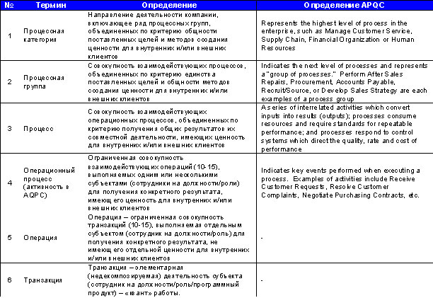 Вернемся к вопросу определений. В одном из проектов создания системы процессов, нами были предложены следующие формулировки (см. таб. 1).