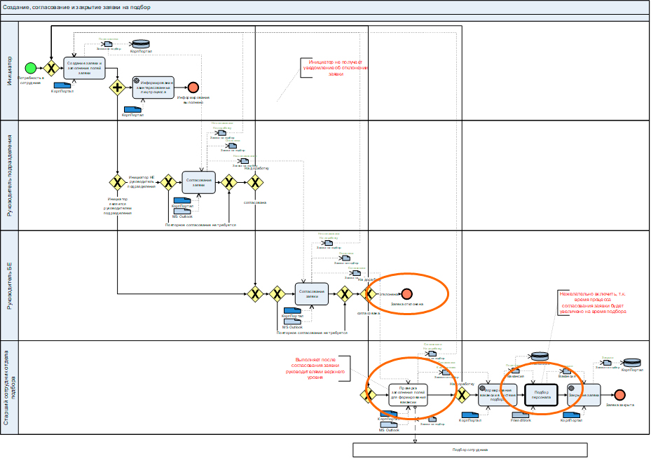 Проблемой является то, что проверка корректности заполнения заявки на подбор выполняется специалистом после того, когда руководитель подразделения и руководитель бизнес-единицы уже ее согласовали. То есть в случае выявления формальных замечаний, заявку придется возвращать в самое начало бизнес-процесса, что существенно увеличивает его длительность и приводит к дополнительным затратам.