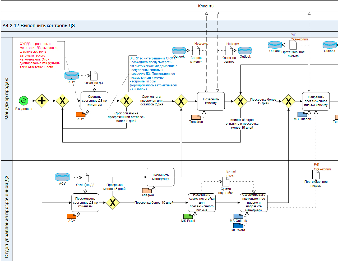 На том же рис. 6 видно, что бизнес-процесс не интегрирован по информационным системам – наблюдается ручная передача информации в Outlook, ручная выгрузка из АСУ в MS Excel, потом в MS Word, сохранение в pdf-формат, звонки и e-mail-ы клиентам.