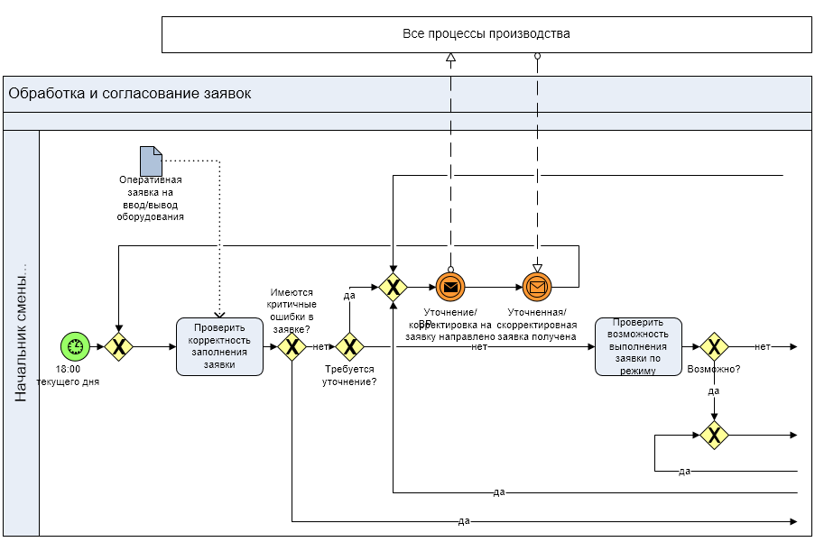 Понятно, что при дальнейшем использовании моделей для автоматизации в конкретной BPMS нужно будет уточнять ситуации, возникающие при отправке-получении сообщений. Но для проекта комплексного моделирования процессов очень важно, чтобы сотрудники понимали, для чего, как и когда они «запускают» на выполнение другие процессы, как синхронизируют свой процесс с ними.