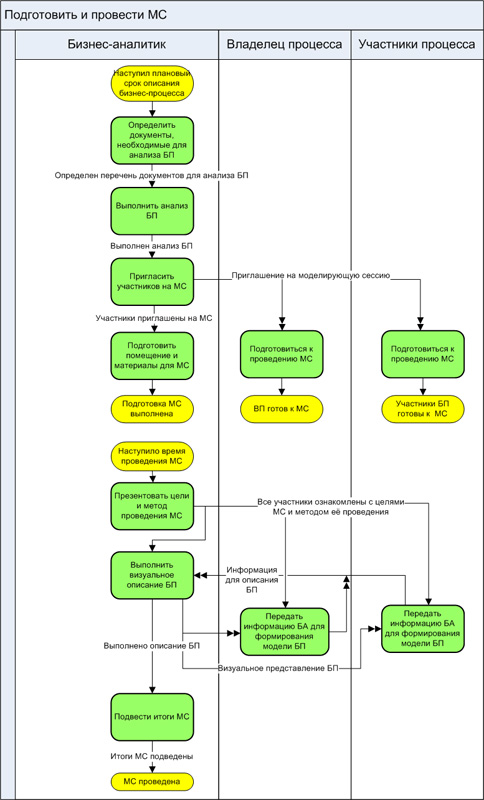В начале МС бизнес-аналитик кратко рассказывает о целях ее проведения и методическом походе. Затем на флипчарте рисуется контекстная диаграмма процесса (процесс как «черный ящик»). Сверху указываются нормативные документы. Определяется структура подпроцессов. Обсуждаются основные входы/выходы. Далее выбирается один из подпроцессов, который рассматривается детальнее.