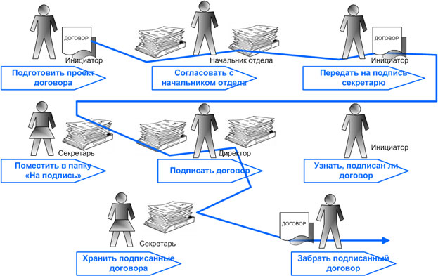 Для тех читателей, которые полагают, что указанные выше рассуждения годятся только для производственным процессов, ниже приводится рис. 5, поясняющий процесс согласования и утверждения договора. В данной, весьма упрощенной модели, Инициатор готовит проект договора и передает на согласование Начальнику отдела. У этого руководителя уже возникает «межоперационный запас» - папка с документами на подпись. Далее на рисунке показаны места, где документы (в т.ч. договоры) накапливаются и хранятся.
