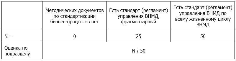 Стоит отметить, что в данном случае уже имеет место некоторая субъективность. Что значит «фрагментарный стандарт»? Для меня это понятно – в нем отсутствуют или плохо проработаны необходимые фазы управления жизненным циклом ВНМД компании. Например, не описаны требования по вводу ВНДМ в действие и т.д. Для проведения оценки по данному критерию необходимо использовать соответствующий чек-лист. Еще пример. Оценка по подразделу «Качество ВНМД» осуществляется следующим образом: