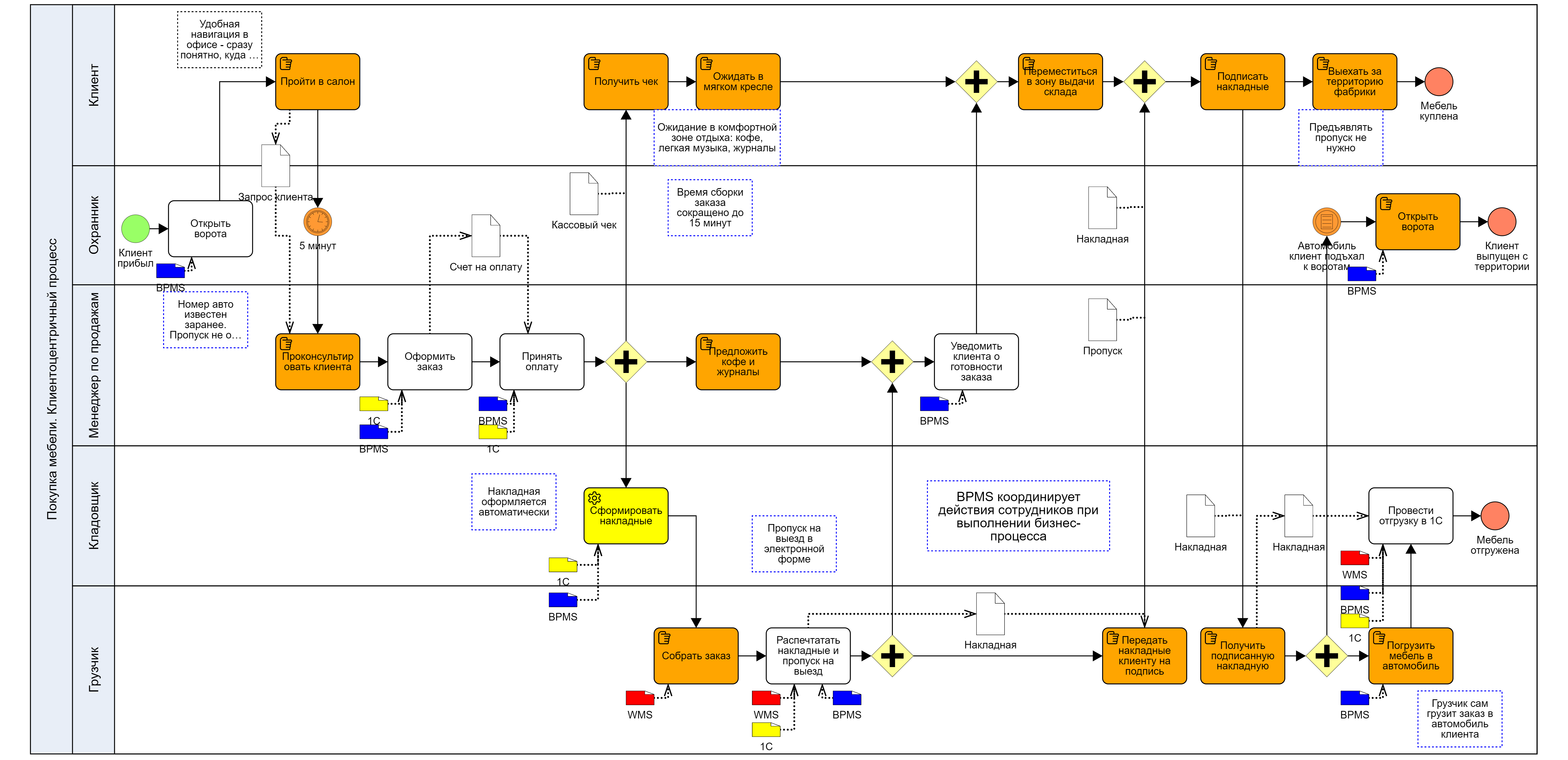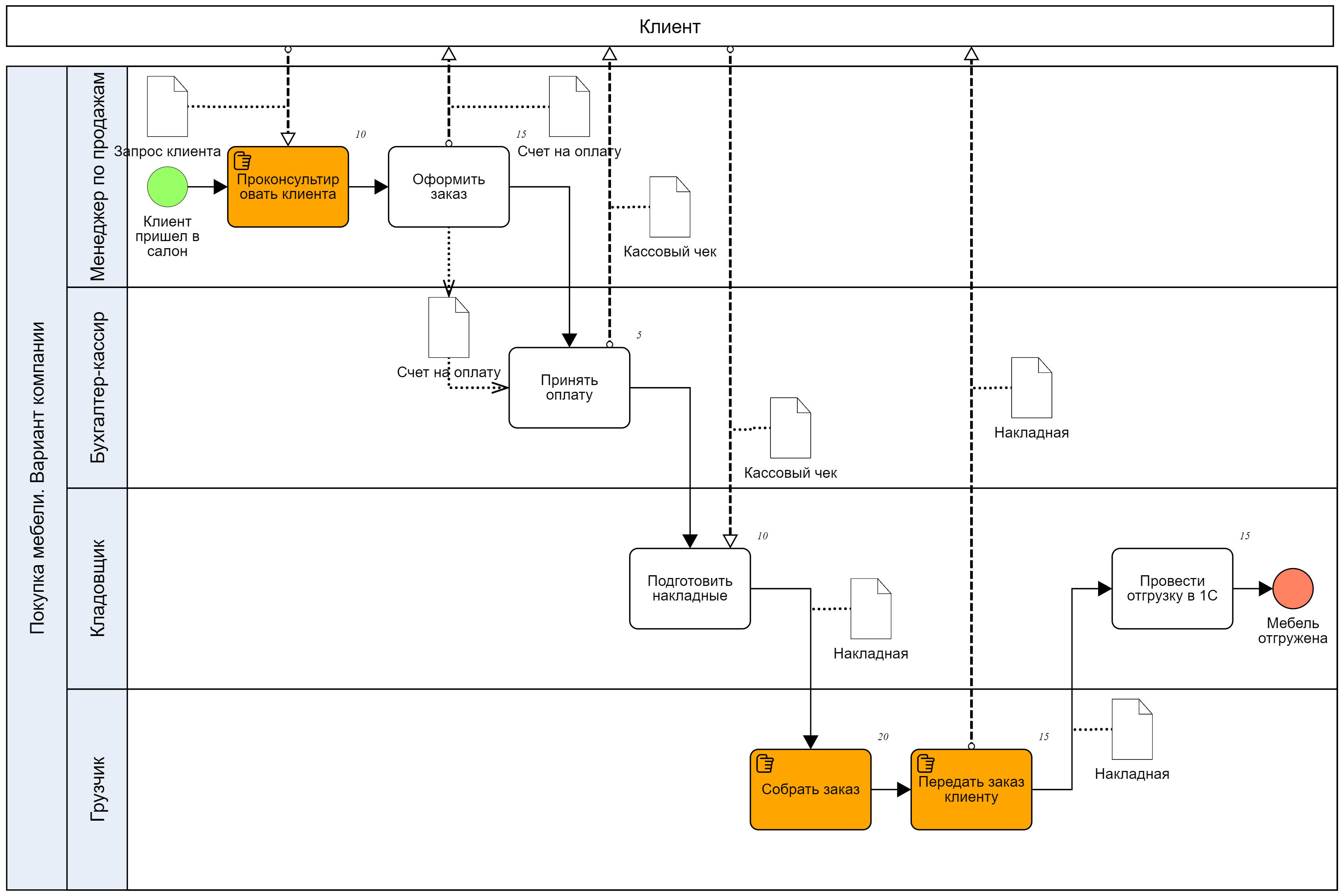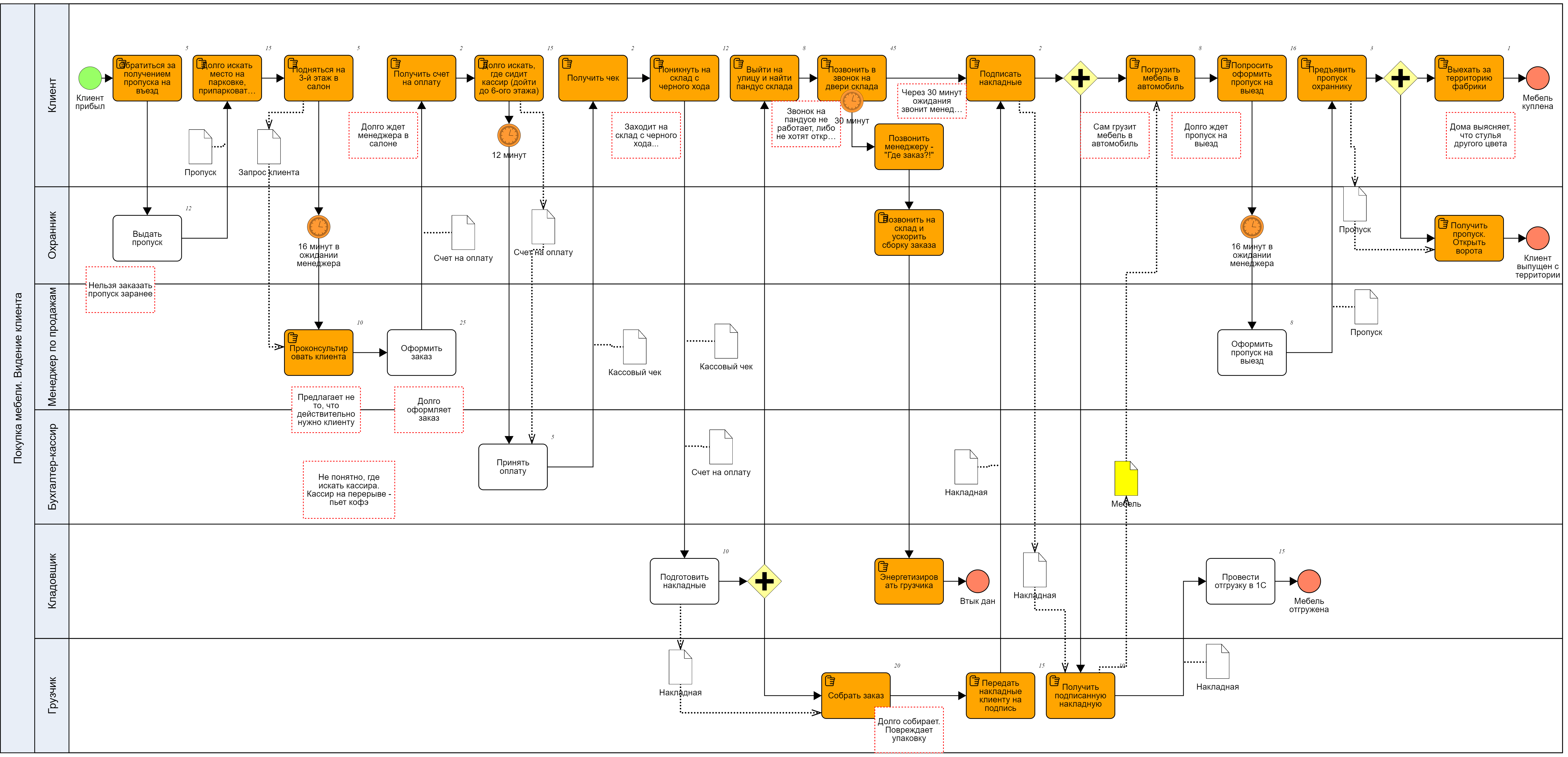 Внутри процесса возникают задержки, которые условно (с некоторым нарушением смысла, вкладываемого в таймеры нотацией BPMN) показывают, что клиент ожидает сначала менеджера в салоне, потом кассира, затем сборки мебели и, наконец, оформления пропуска на выезд.