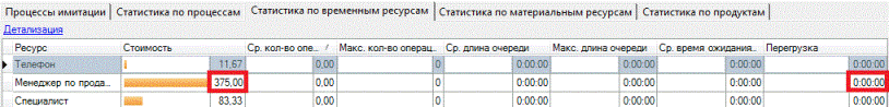 Статистика по временным ресурсам позволяет быстро идентифицировать: - наиболее дорогой временной ресурс – в данном случае Менеджер по продажам является ресурсом с наибольшим значением в колонке Стоимость, - временной ресурс, на ожидание которого было затрачено наибольшее время – в Business Studio есть возможность создавать очередь из процессов к временному ресурсу, если в момент старта процесса необходимый временной ресурс занят или недоступен. Например, если параллельно поступает звонок от клиента и необходимо подготовить коммерческое предложение, то Менеджер по продажам отвечает на звонок, а подготовка коммерческого предложения ставится в очередь к сотруднику, - перегрузку временного ресурса - отражается в колонке Перегрузка, этот параметр показывает тот объем назначенных задач, которые ресурс не успеет выполнить, даже если он работал 100% доступного времени.