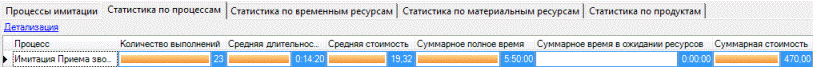 Статистика по процессам наглядно идентифицируют наиболее затратный процесс по каждому из параметров. Если параметры процесса являются неудовлетворительными, то по гиперссылке «Детализация» можно открыть детальную статистику по процессу и проанализировать причины неудовлетворительных значений параметров, полученных в результате имитации. Подробная статистика включает в себя данные по подпроцессам (операциям) (см. рис. 5):