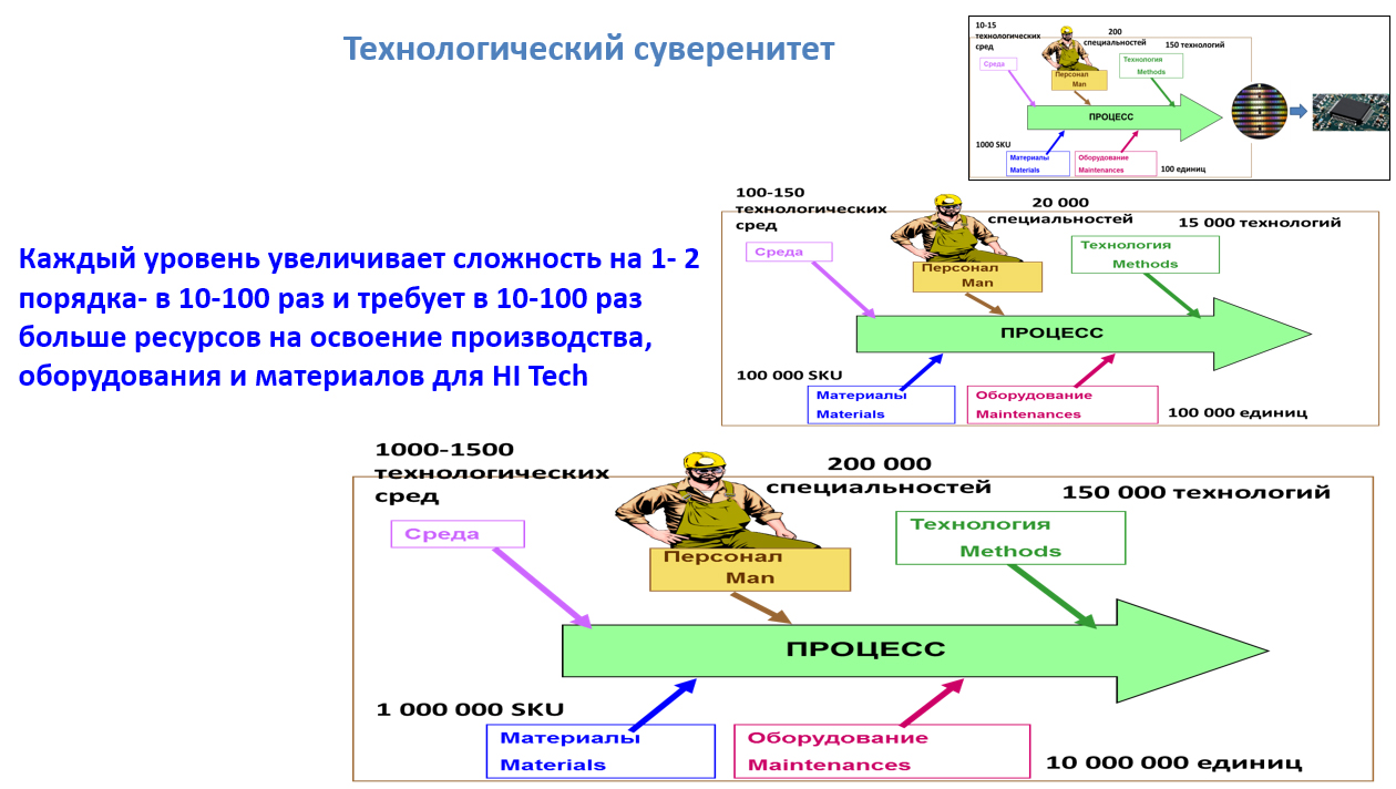 Ни в одной стране мира нет созданной «с нуля» полной пирамиды High-tech. Создавать такую «пирамиду» очень дорого и долго. Весь мир работает в режиме кооперации: высокоточные степеры выпускает только Голландия и Япония, фабрики по выпуску находятся на Тайване и в Южной Корее, США и Япония производят особо чистые газы и химикаты. Поэтому, пока страна живет в режиме санкций и эмбарго, говорить о достижении технологического суверенитета можно только в очень ограниченном объеме и в узких отраслях.