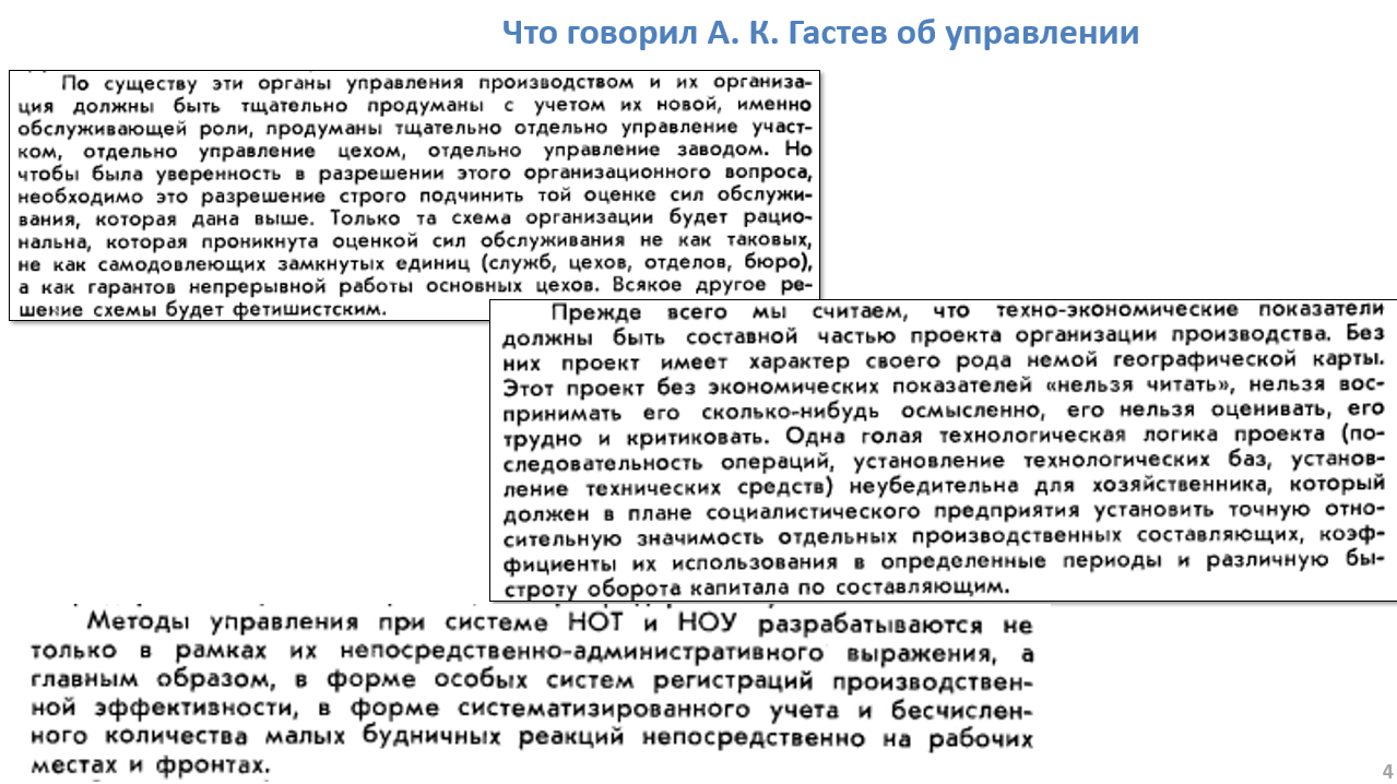 «Методы управления при системе НОТ и НОУ разрабатываются не только в рамках их непосредственно-административного выражения, а главным образом, в форме особых систем регистрации производственной эффективности, в форме систематизированного учета и бесчисленного количества малых будничных реакций непосредственно на рабочих местах и фронтах.» [ 1, с. 374].