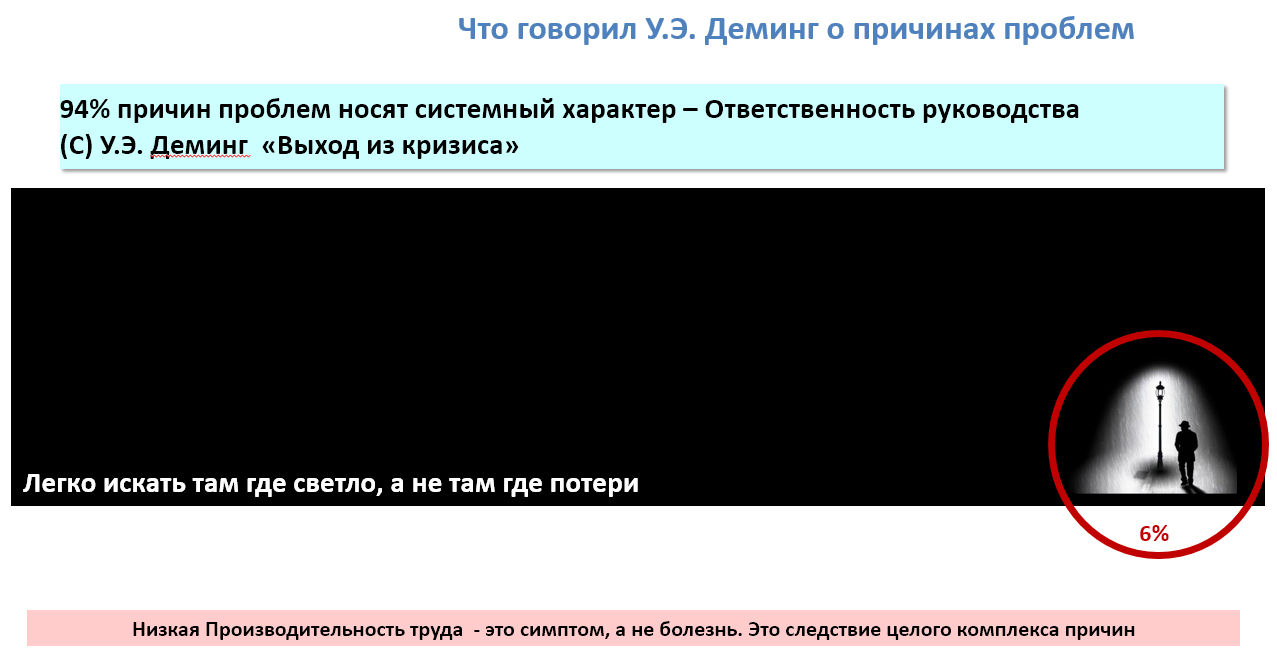 Между тем, многие консультанты игнорируют известнейшие слова д-ра Э. Деминга о том, что «94% проблем принадлежат системе (ответственность менеджмента), 6 % проблем - особые [2, с.278]. Конечно, легче искать проблемы на рабочих местах, чем убеждать руководителя в том, что именно он создает 94% проблем.