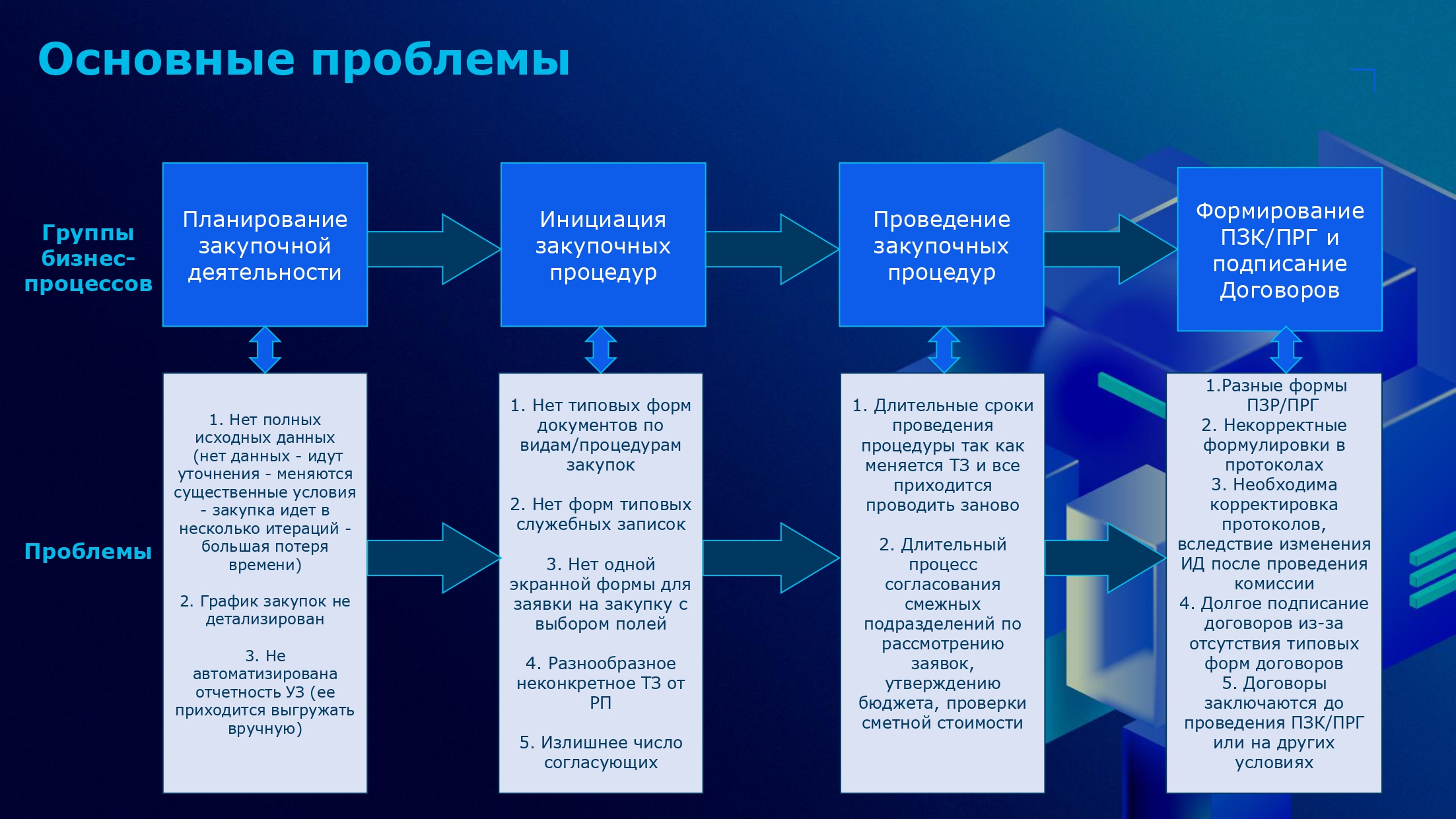 Изначально каждый этап процесса закупок содержал целый перечень проблем, таких как отсутствие полных исходных данных, детализированного графика и типовых форм документов, некорректные технические задания, излишнее количество согласующих, длительные сроки, некорректное заключение договоров и т.д.