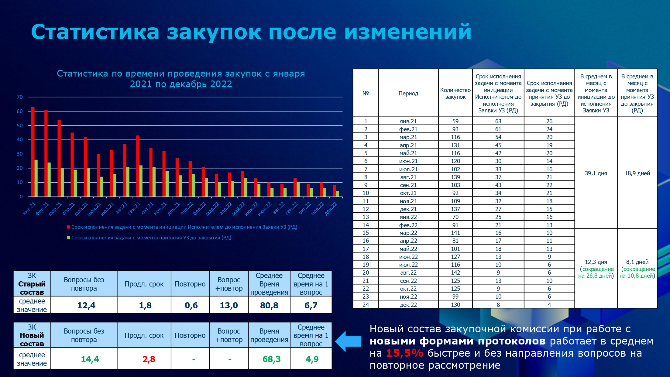 4. Новый состав закупочной комиссии при работе с новыми формами протоколов выполняет свои задачи в среднем на 15,5% быстрее. Что важно: вопросы перестали отправляться на повторное рассмотрение.