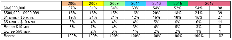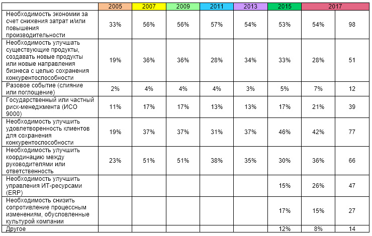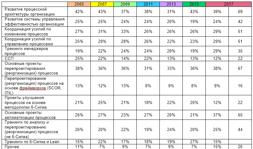 Далее приводятся таблицы, раскрывающие тренды использования процессного управления под разными углами зрения.