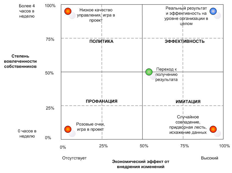 Рассмотрим четвертую пару критериев – «Степень вовлеченности собственников/ экономический эффект от внедрения изменений», представленную на рис. 4. Одним из критических факторов успеха проекта является вовлеченность собственников. Степень вовлеченности можно мерить количеством затрачиваемого времени, как предлагалось делать для руководителей (специалистов). Вот только шкалу нужно откалибровать – собственники не обязаны тратить столько же времени на проект, сколько линейные руководители.