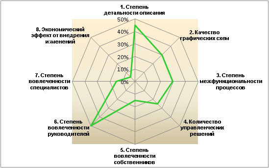 На рис. 6 показана ситуация с одним из проектов в крупной компании (экспертная оценка автора статьи). Процессное управление в ней внедряется уже третий год. В целом, ситуацию можно охарактеризовать как положительную. Разработано много детальных и качественных схем, которые использованы для анализа и регламентации деятельности сотрудников, в том числе при помощи web-портала (моделирования осуществляется в среде моделирования Business Studio 4.0).