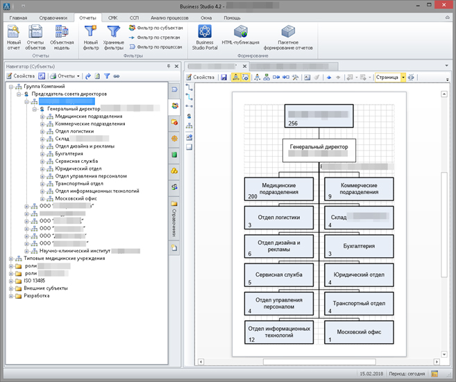 На иллюстрации ниже приведён пример моделирования в среде Business Studio реальной группы компаний, предоставляющей специализированные медицинские услуги в городах России.