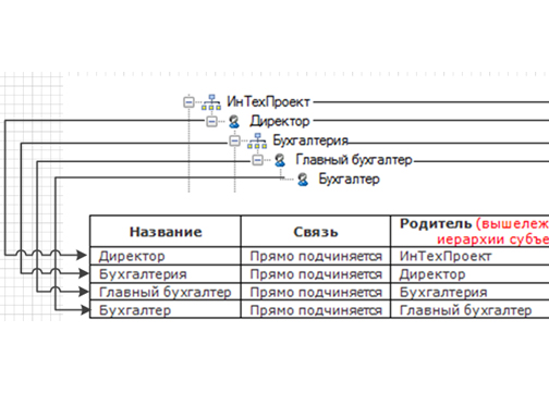 В колонке «Название» указывается наименование субъекта, в колонке «Связь» указывается «Прямое подчинение» для формирования иерархии субъектов, в колонке «Родитель» указывается наименование субъекта (Должность или Подразделение), который находится выше по иерархии.
