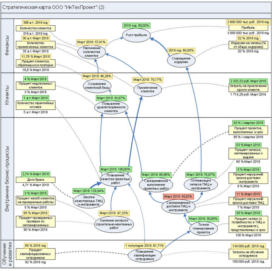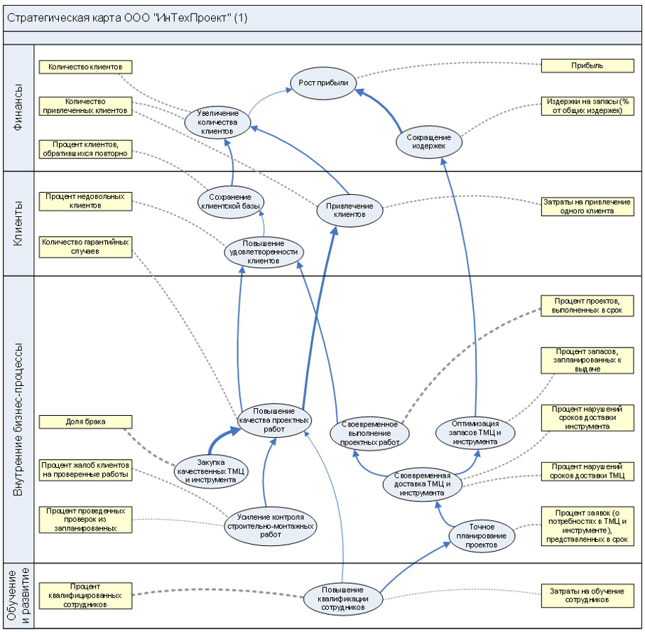 На рис. 2.2 показано построение стратегической карты для вымышленной компании ООО "ИнТехПроект". Эта диаграмма имеется для ознакомления в демо-базе, поставляемой вместе со средой моделирования Business Studio от компании “СТУ-Софт”.