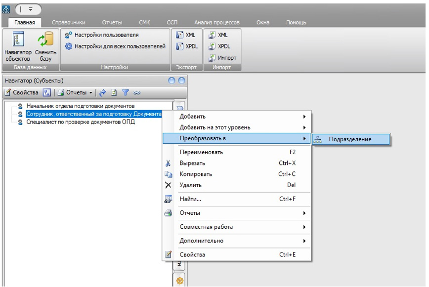 Очевидно, что «Сотрудник, ответственный за подготовку Документа» - это роль, но по правой кнопке преобразовать его можно только в Подразделение.