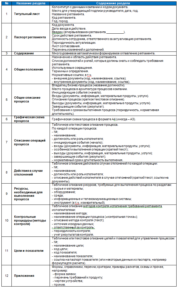 В своей компании вы сможете сами определить структуру и содержание конкретных разделов. При этом важно помнить, что представляет собой процесс, как объект управления, и регламентировать всё его аспекты (не только алгоритм выполнения). В