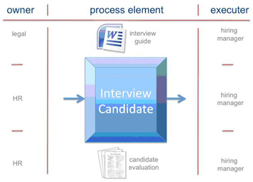 Да не путайте слова своих последователей с чужим мнением. Диаграммы процессов нуждаются в контексте для придания значения условным обозначениям и графическим объектам. Для того чтобы процесс был понятен конечным потребителям, он должен отображаться с помощью очевидных и простых знаков. Документы, формы, ссылки и другие виды информации, поддерживающие условные обозначения и графические объекты нотации, должны быть доступны во время изучения диаграммы. Более того, чтобы быть актуальной и достоверной, документация должна находиться в собственности и управлении владельца. Мой любимый пример, иллюстрирующий эту мысль, – «интервьюирование кандидата».