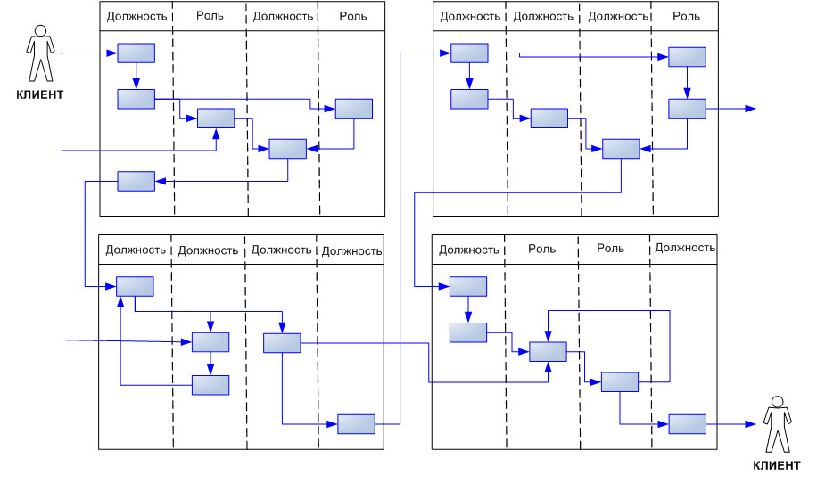 На рис. 1. представлена схема некоторого процесса. Видно, что в процессе участвуют сотрудники разных структурных подразделений, в том числе некоторые из них – в виде ролей (например: «инициатор договора» и т.п.). Процесс завершается определенным результатом. Рассматриваемый процесс формально можно назвать «сквозным», т.к. он пересекает границы нескольких структурных подразделений. В то же время, количество операций процесса ограничено. По размеру схема укладывается на лист формата А4 (в крайнем случае – А3). Это говорит о том, что процесс, как объект управления, является относительно простым, обозримым.