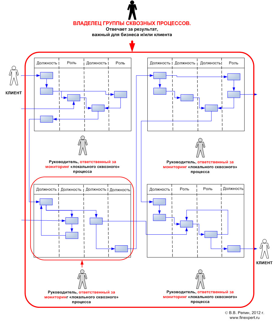Очевидно, что владелец группы сквозных процессов как раз и заменяет собственника. Он становится «смотрящим» за эффективностью выполнения определенной группы взаимосвязанных процессов компании, обеспечивая получение результата.