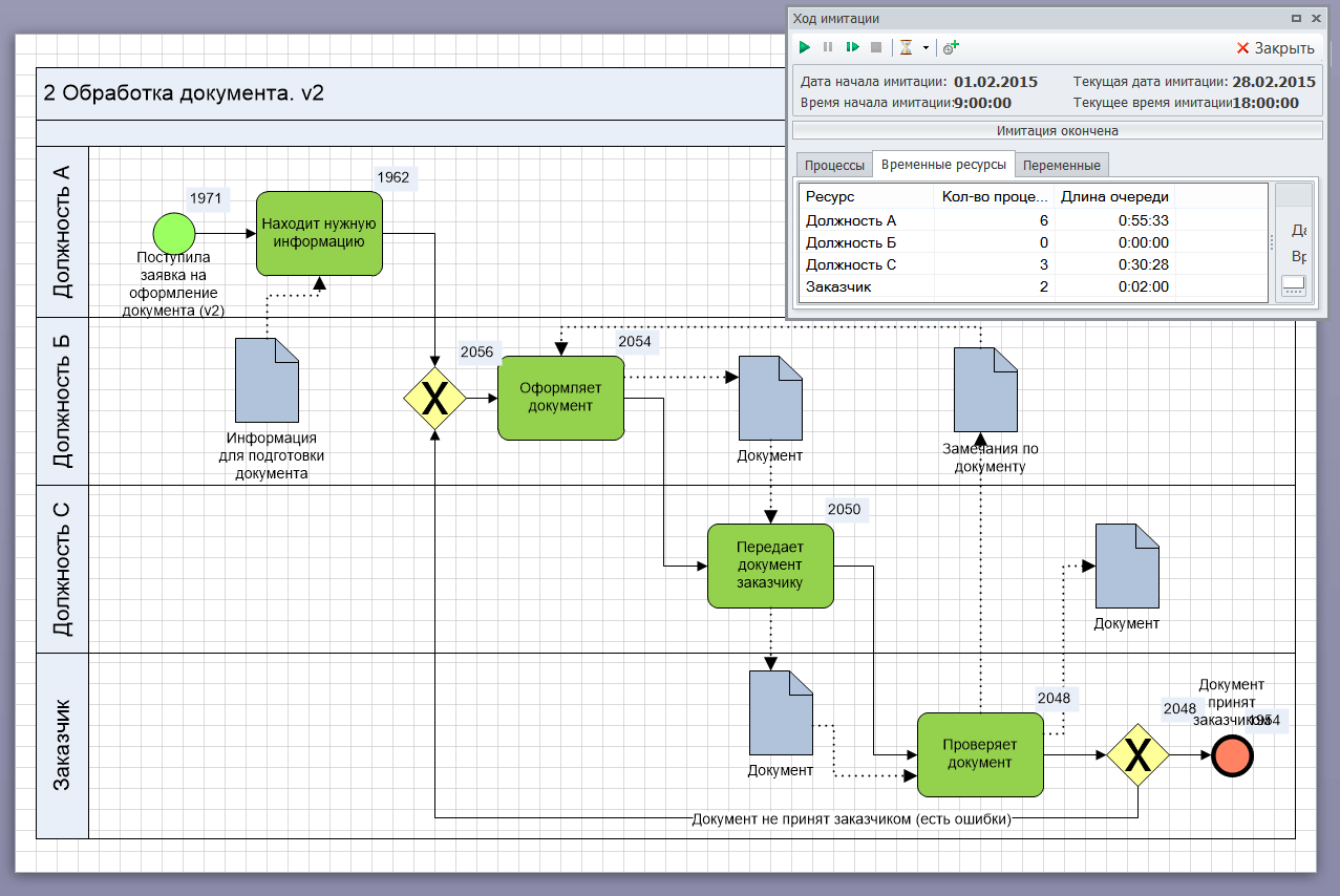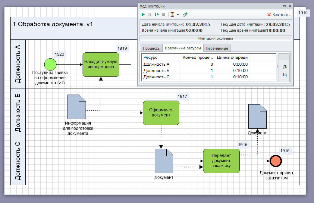 Посмотрим теперь, что будет в реальной ситуации. Для этого опишем рассматриваемый бизнес-процесс и проведем его имитационное моделирование в среде Business Studio 4.0. Для начала, пусть на каждой должности находится по одному сотруднику.
