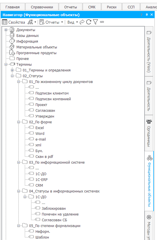 На рис. 2 показан справочник «Документы». Его можно разделить на две части. Первая – это типы документов, которые используются при выполнении процессов. Они сгруппированы в папках по названию категорий бизнес-процессов.