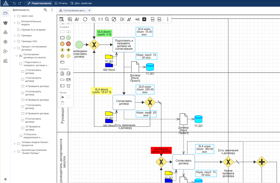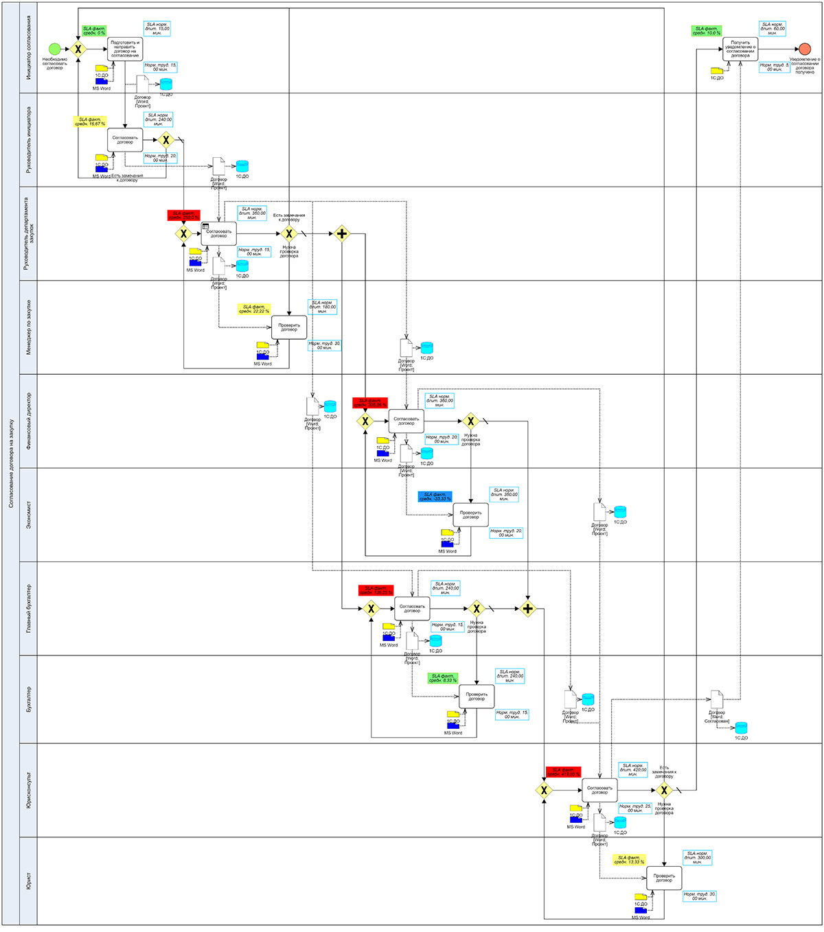 Общая схема бизнес-процесса согласования договора на закупку с индикаций нормативных и фактических значений (отклонение в %) показана на рис. 4. Руководители могут использовать Business Studio 7 (Portal Viewer) для мониторинга исполнения OLA для всех ключевых кросс-функциональных бизнес-процессов компании (в случае, если в Business Studio создана архитектура процессов и соответствующие модели процессов на операционном уровне).