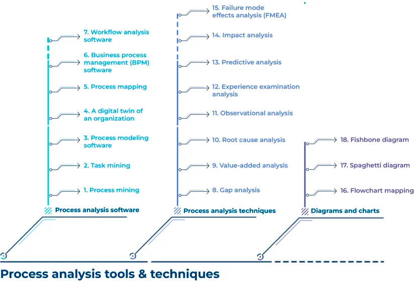 Анализ процессов может быть выполнен с помощью различных диаграмм и программного обеспечения. Эти инструменты описаны ниже в зависимости от категории.