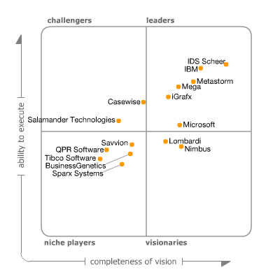 Если вспомнить отчет Gartner BPA Magic Quadrant за 2010 год, то там обозначено всего 15 игроков, и среди лидеров можно увидеть следующие компании: IDS Scheer/ Software AG, IBM, Metastorm, Mega, iGraph и Microsoft. Однако на российском рынке из этих вендоров активно играют лишь трое: IDS Scheer/ Software AG с продуктом ARIS Platform, IBM с продуктами WebSphere Business Modeler и Telelogic, а также Microsoft с продуктом Visio. Это значительно упрощает задачу выбора BPA-решения. Перечень наиболее распространенных в России BPA-систем, 2011
