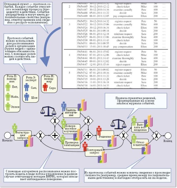 Лишь немногие инструменты бизнес-анализа предлагают развитые возможности добычи данных, но они не являются процессно-ориентированными, а предназначены для извлечения сведений, помогающих в принятии тактических решений, и не охватывают процесс как таковой. Инструменты управления бизнес-процессами (business process management, BPM), в свою очередь, позволяют с помощью соответствующих моделей анализировать текущие и планируемые операционные процессы, но, к сожалению, эти модели часто не соотносятся с реальными данными по событиям.