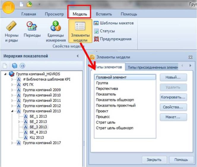 Актуализация регламентов целеполагания, планирования, и формирования отчетности по стратегическим целям и показателям с учетом использования системы Формирование модели целей и показателей на выбранный временной период (развернутый пилот на год, затем этап “промышленной” эксплуатации системы) На тестирование системы по развернутому пилотному направлению (бизнес-направление, отдельная компания в холдинге) необходимо закладывать не меньше года, так как год – полный цикл отчетности и планирования, и в течение года можно выловить все проблемы и “баги” в настройке модели целей и показателей, в настройке формул для автоматизации расчетов в ежемесячной/ ежеквартальной отчетности по KPI. Настройка справочников системы должна учитывать требования и устоявшиеся правила корпоративной методологии целеполагания, например, на рис.2, в справочнике элементов модели необходимо создать типовые элементы, из которых будет далее формироваться корпоративная модель целей и показателей. Если методологией предусмотрена определенная классификация целей, то ее необходимо отразить в данном справочнике, – общекорпоративные стратегические цели (обязательные для всех бизнес-направлений, “сквозные”, присутствуют во всех стратегических картах дочерних компаний холдинга), и стратегические цели (специфичные, для каждого направления – свои цели). Также можно ввести несколько типов показателей, как представлено на примере на рис.2., – общекорпоративные показатели (измеряющие достижение общекорпоративных целей), показатели (измеряющие достижение целей), проектные показатели.