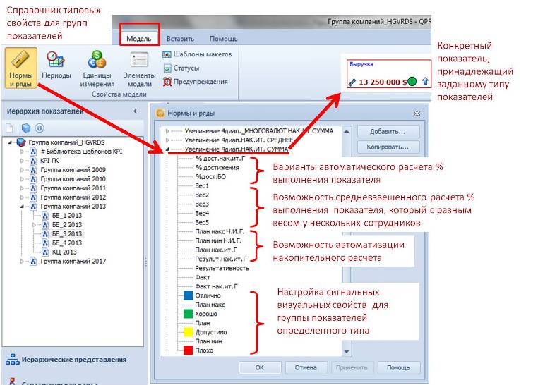 Рис.5. Настройка типовых свойств для групп показателей – Нормы и Ряды На рис.6. наглядно показано, какие возможности обеспечивают те или иные свойства (ряды) данного типа показателей.