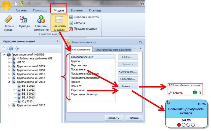 Рис.2. Настройка справочника Элементов Модели Целей Показателей Компании Для каждого типа элемента модели (каждого типа цели, показателя, перспективы ССП) можно настроить визуализацию (через макет) которая позволит делать наглядные отчеты, страт карты и дэш-борды, см. рис.3.