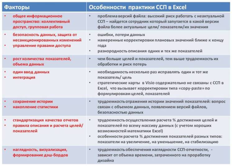 Рис.1. Особенности практики ССП в Excel в масштабах холдинга Любую систему надо настраивать под правила компании и любая система будет иметь свои ограничения. Идеальных тиражных систем нет, или это под заказ, дольше и дороже. Многие ограничения можно будет понять только на практике, после длительного (в течение года) использования системы. Также, необходимо отметить, что многие ограничения в принципе нет возможности выявить на старте проекта, так как в процессе эксплуатации системы будут рождаться новые требования, которые заранее не предсказать, и эти новые требования также могут натолкнуться на ограничения стандартного функционала тиражной системы. Я бы выделил 2 крайних случая, когда компания решила выбрать и внедрить какую-либо систему по управлению KPI или ССП: